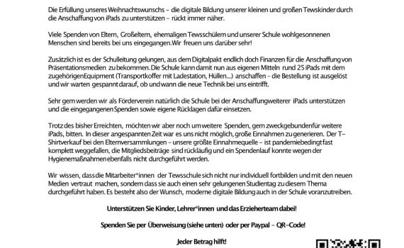 Liebe Eltern, liebe Förderer, liebe Kinder, Die Erfüllung unseres Weihnachtswunschs – die digitale Bildung unserer kleinen und großen Tewskinder durch die Anschaffung von iPads zu unterstützen – rückt immer näher. Viele Spenden von Eltern, Großeltern, ehemaligen Tewsschülern und unserer Schule wohlgesonnenen Menschen sind bereits bei uns eingegangen. Wir freuen uns […]